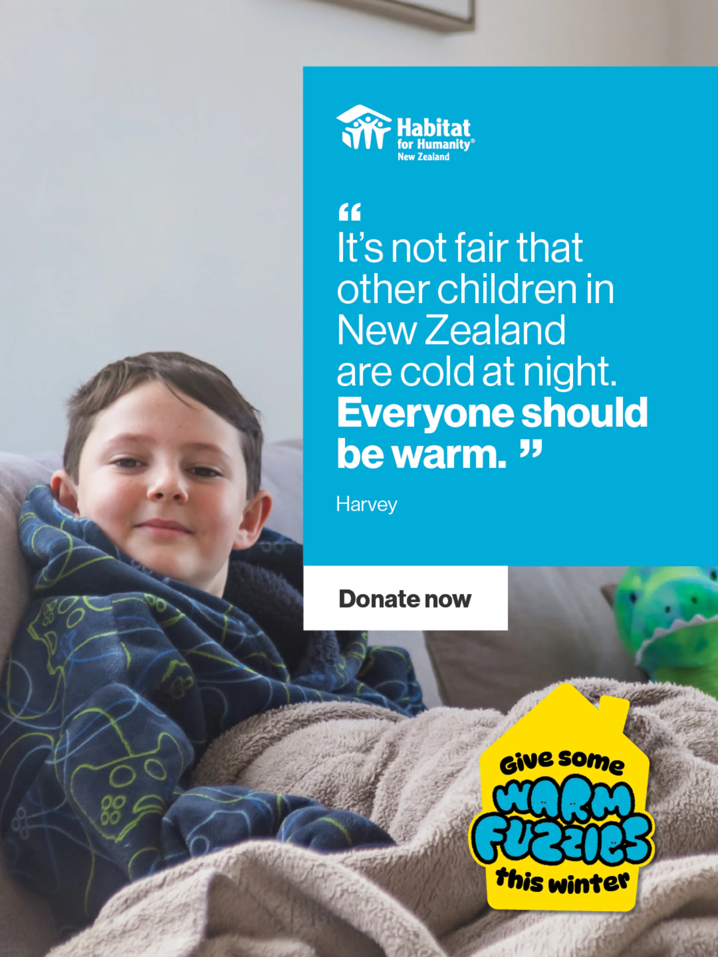 Habitat New Zealand’s annual Warm Fuzzies Appeal is all about ensuring more Kiwis have a warm, dry, and healthy home, especially during winter. The appeal shared messages from Kiwi children and Habitat team members on the importance of a warm, dry, healthy home for families in New Zealand.