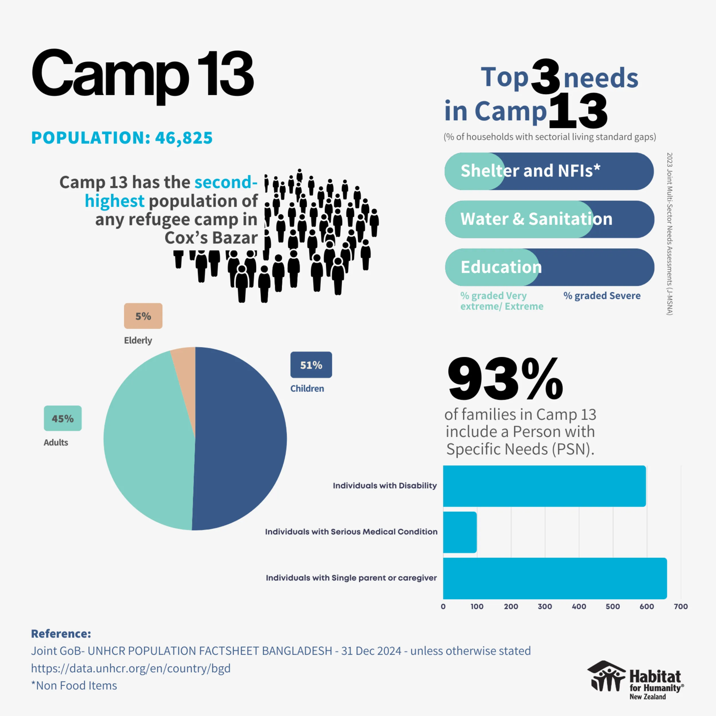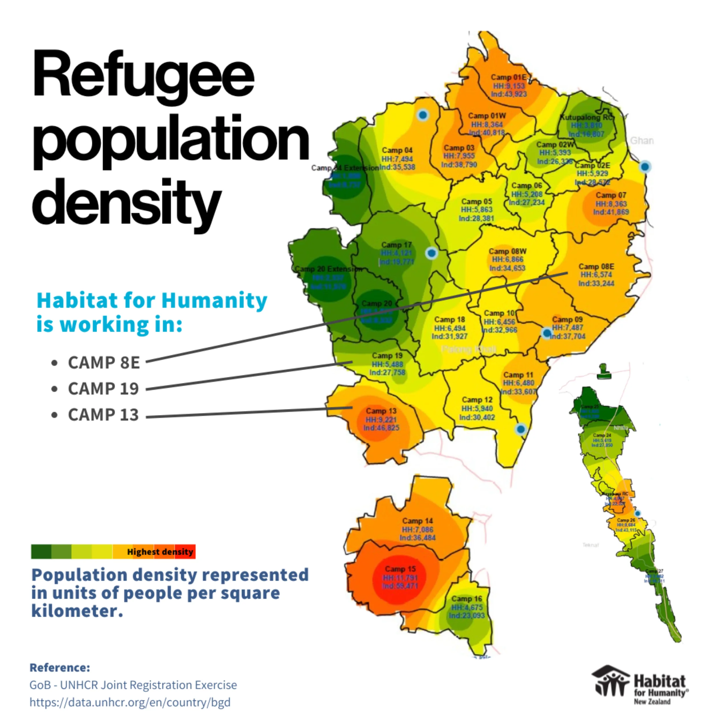 Habitat is working to address inadequate shelter in three Rohingya refugee camps in Cox’s Bazar, including Camp 13, the second most populated camp in Cox’s Bazar with a population of just over 46,800.