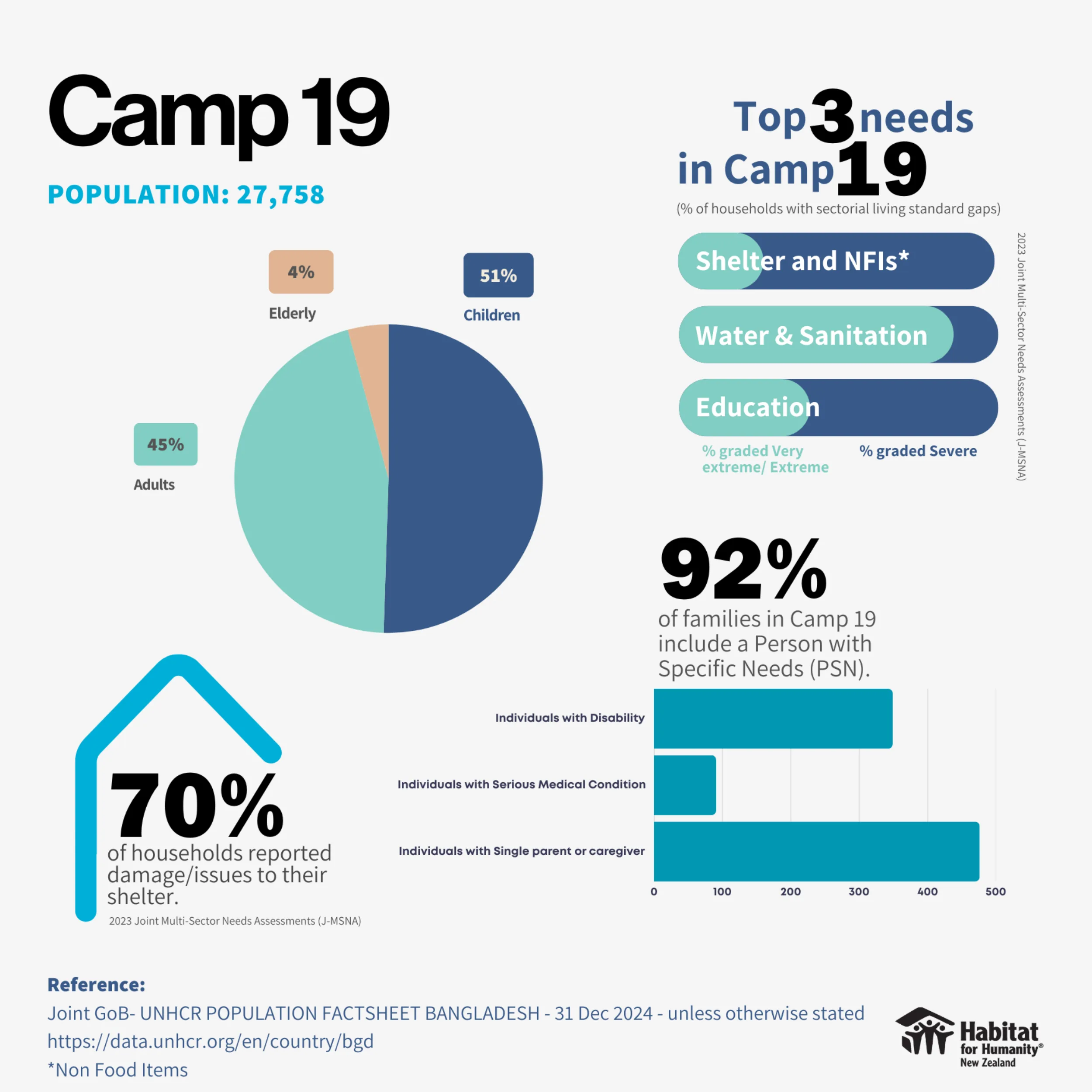 With this in mind, support is needed for homes and families who aren’t simply passing through. Complicated geopolitical circumstances are leaving people in camps for years and the reality of living in indecent homes is serious; as recently as December 2023, it was reported that 73% of households in Camps 13, 19, and 8E were living with shelters ranging from “degrading living conditions” to “total collapse of living standards, with potentially immediately life threatening outcomes”.