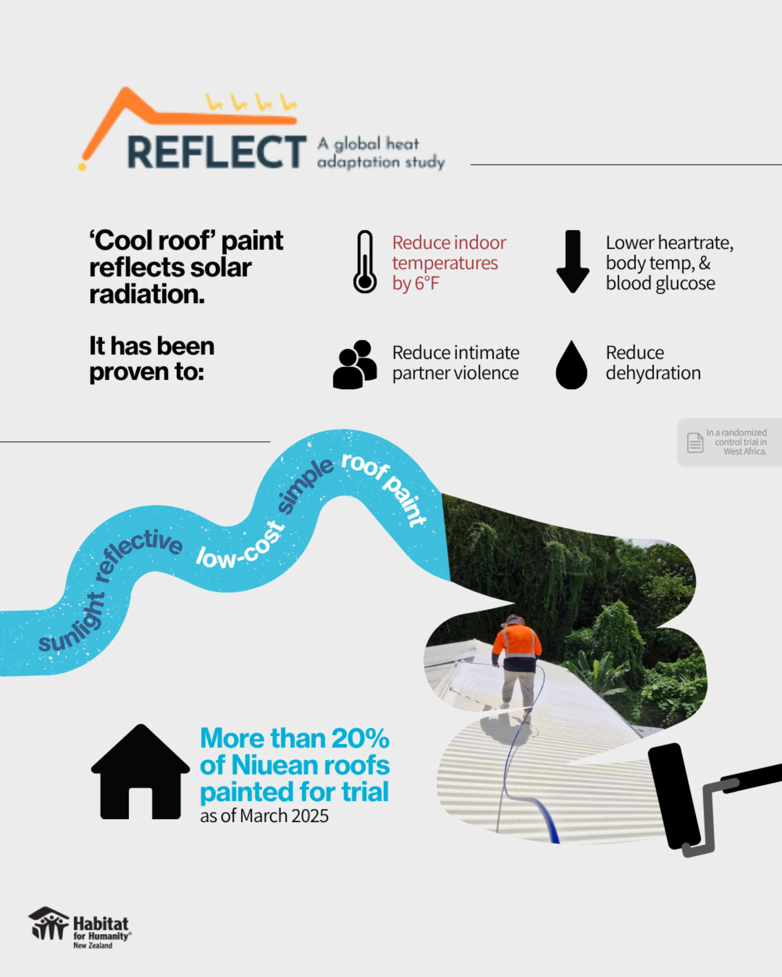 Habitat for Humanity New Zealand is supporting the REFLECT project, an evidence-based study in Niue researching the effectiveness of heat-reflective paint on improving the health and wellbeing of homeowners.